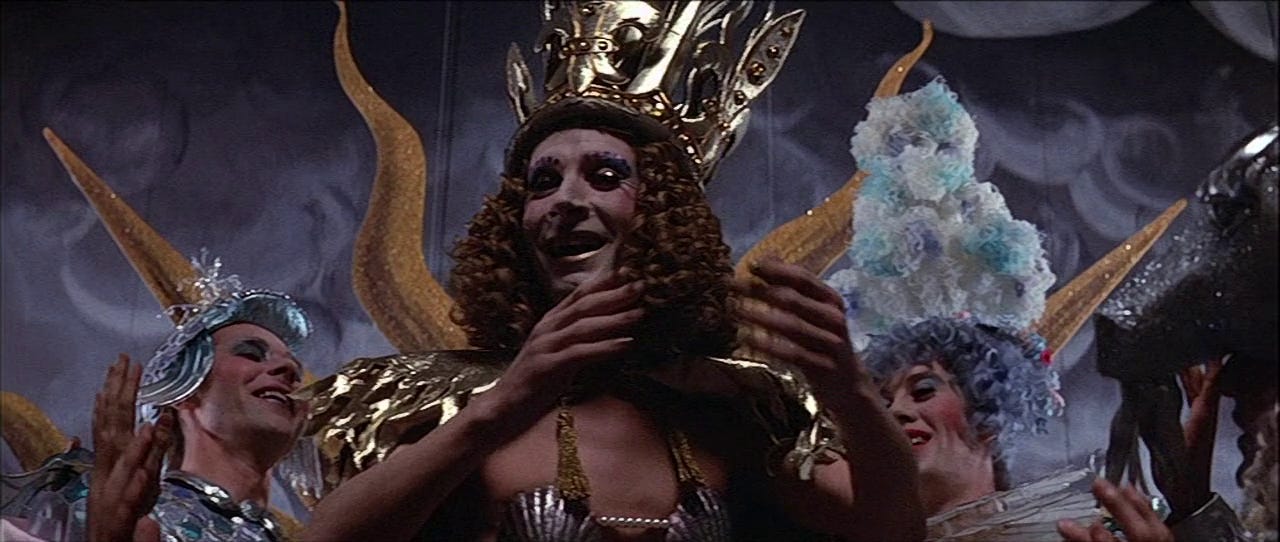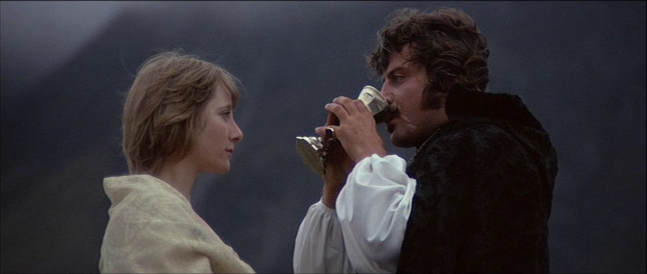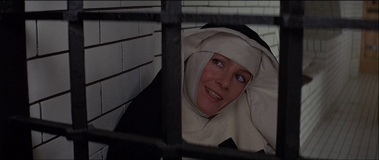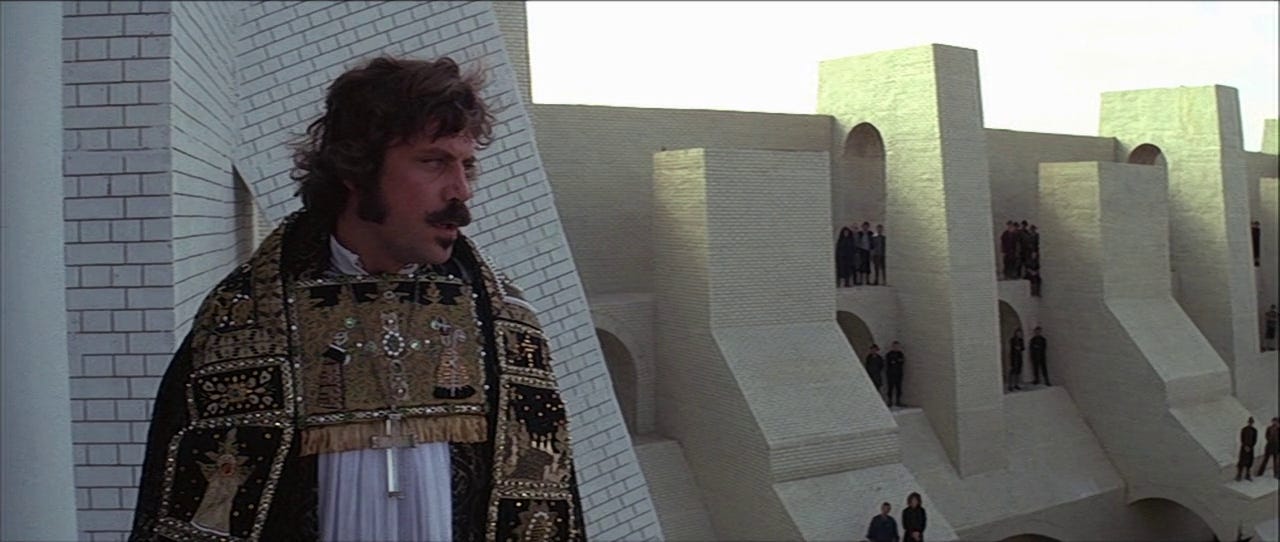 While the majority of flesh on screen is (depressingly inevitably) female, this is the rare film where a man is the explicit object of lust. Film stars are almost always implicitly lust objects (except when they’re pulling a Funny Face and playing on their ability to hide their light), but it’s rare that this bubbles up beyond subtext, especially about a man. On first watch, it was a revelation to me to see Reed, a man I remembered only in end stage dissolution or via outlandish talk show appearances, justify his place as the gravitational centre of this vortex of lust. Like knowing Orson Welles only through Paul Masson commercials and then catching Citizen Kane, it was a singular experience. Of course, Reed needs to be devastatingly attractive: he’s an unrepentant fuckboi, and only with liberal application of sex appeal does it feel justifable for women to knowingly crash themselves against the rocks of society’s mores to lie among his voluminous chest hair. Although Grandier leaves at least three women in the lurch, he is not repentant or unresolved about his desires, and the film stands with him. On the stand, facing capital punishment, he states his position: ‘I have been a man. I have enjoyed women. I have enjoyed power.’ The modern softboi post-factum justifies his philandering with arguments against monogamy as an outmoded tool of heteropatriarchal conditioning. Similarly, Grandier’s sophistry lets him justify living the priestly life while also enjoying the sins of the flesh. His common-law wife questions his thinking: ‘St Paul says that he who marries does a good thing, but he who remains chaste does something better.’ He flits out of the yoke, responding, ‘Then I am content merely to do a good thing and leave the best to those that can face it.’