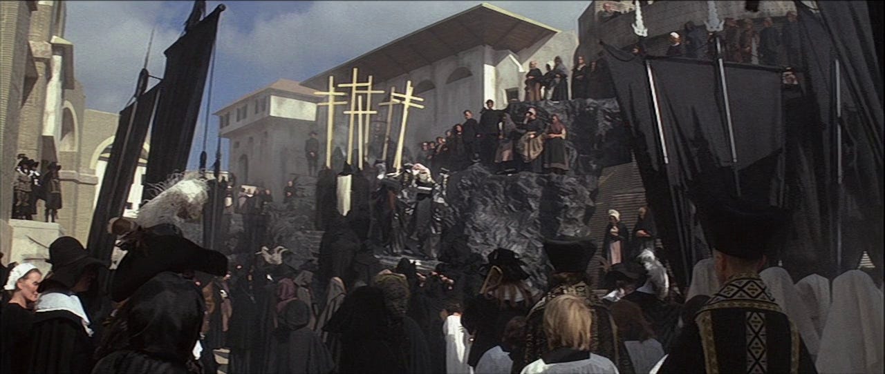 Russell, as in all his work, is drawn to those who steal fire from the gods, especially if he can show them doomed to have their organs eternally pecked. Everyone in the film is driven by sex: the prosecutors by their meretricious attempts to expunge it (which also allow them to be in prurient proximity to it), the nuns in sublimating it, the patriarchs and doctors in trying to brutally control it. Only Grandier dares to take what others dance around. Sex and pain are intimately linked, an intertwining that is sublimated at the heart of Christianity, from Jesus himself to Julian of Norwich. In one brilliant scene, a succession of busts in Grandier’s chambers are destroyed by guards, a chilling threat on his body that also connects Grandier’s sufferings with those of Jesus. Likewise, Russell is the artist who enjoys the chafe of artistic suffering, aware that given total licence he would have nothing to kick against and create work about. He’s undoubtedly a knowing provocateur, a very naughty boy, but there are moments when he’s also the messiah.